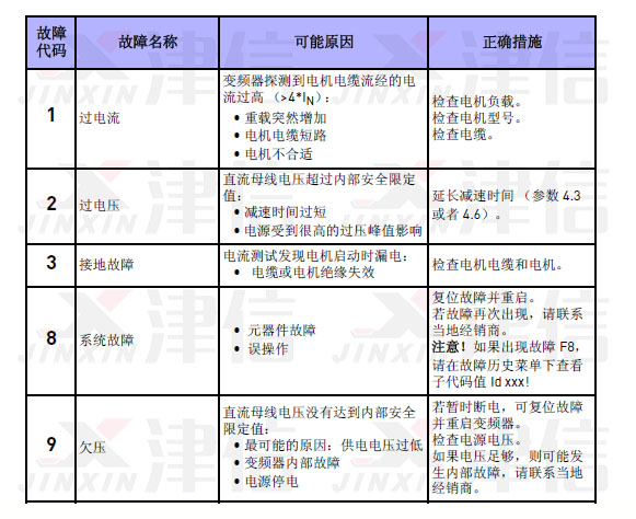 偉肯變頻器的故障和時(shí)間記錄存儲(chǔ)在故障歷史子菜單內(nèi),用戶可以瀏覽該菜單。下表列出了不同的故障代碼及其發(fā)生原因和更正措施。