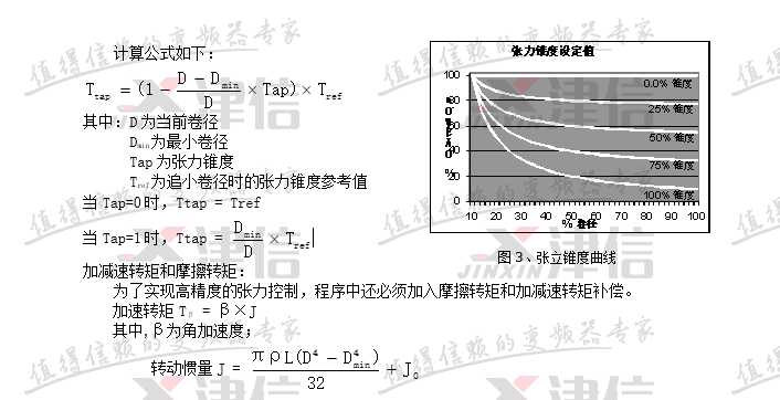 有了當(dāng)前卷徑值,和張力錐度設(shè)定值,就能計算當(dāng)前張力。張力與卷徑的關(guān)系如圖3所示,當(dāng)張力錐度為0時,張力保持恒定不變,相當(dāng)于恒張力控制;當(dāng)張力錐度為100%時,卷徑每增大1倍,張力就下降一半,相當(dāng)于恒轉(zhuǎn)矩控制。