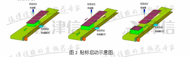 當(dāng)傳送帶上的物品碰到“貼標(biāo)啟動傳感器”后,凸輪啟動,標(biāo)簽軸跟隨主軸移動,直到貼標(biāo)完成,凸輪軸脫離則由“標(biāo)簽定位傳感器控制”,如圖2所示。